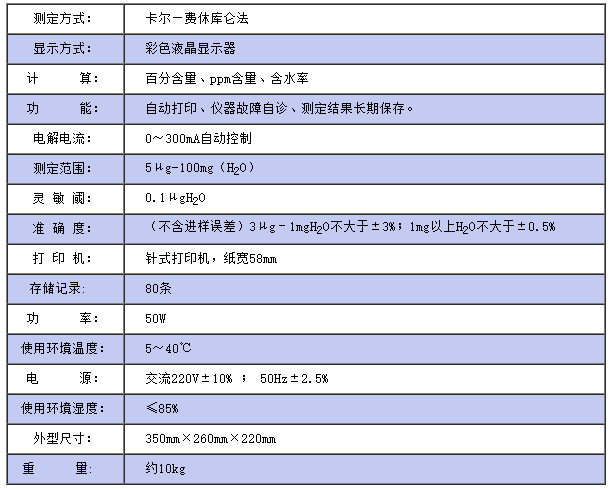 儀器符合GB/T7600及采用卡爾—費休法測定樣品中水分的有關標準,適用于石油化工產品、充油電器設備絕緣油及礦物原料等物質中水分的測定。 該儀器采用了大屏幕彩色液晶顯示,中文菜單,人機對話更直觀,操作更簡便,具有自動換算自動打印和保存測定結果等功能,與同類儀器相比,大大提高了測試靈敏度。