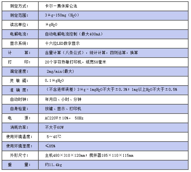 儀器符合GB/T7600;SH/T0246;GB/T606及采用卡爾—費(fèi)休法測(cè)定樣品中水分的有關(guān)標(biāo)準(zhǔn)。 儀器采用了先進(jìn)的自動(dòng)控制電路,電解電流自動(dòng)跟蹤控制,外型結(jié)構(gòu)新穎,從而使該儀器工作更可靠,使用更方便,具有分析速度快(一分鐘出結(jié)果)、操作簡(jiǎn)便、精度高、自動(dòng)性強(qiáng)等特點(diǎn),同時(shí)具有自動(dòng)打印功能,可將實(shí)驗(yàn)結(jié)果、做樣時(shí)間、樣品編號(hào)自動(dòng)打印出來,廣泛應(yīng)用于石油、化工、電力、鐵路、環(huán)保等部門。