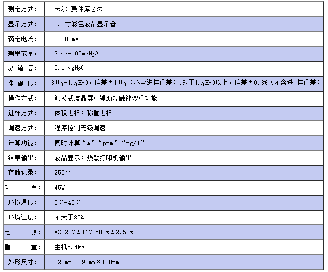 儀器符合GB/T7600及采用卡爾—費休法測定樣品中水分的有關標準, 是采用先進技術研發的,全新的具有人機對話功能新一代水分測定儀器。該儀器采用了雙CPU控制、彩色液晶顯示、觸摸屏控制、中文菜單,具有電極開路、短路報警等故障自檢功能,可儲存255條信息,具有自動計算百分含量、PPM值、自動打印功能。